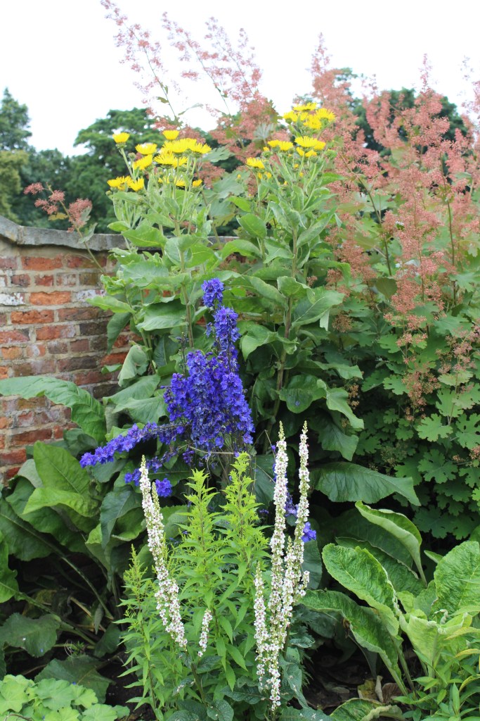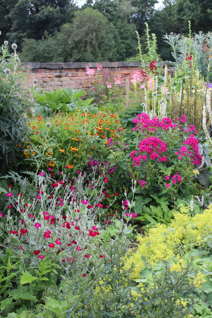 Hollyhocks, echinops, helenium, phlox, dianthus, lady’s mantle